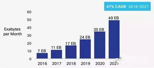 业界广泛认为,5G移动通信直到2020或2021年才会提供,甚至即便到那时也不会广泛提供。但是,随着移动数据流量持续增长(过去5年翻了18倍),可以预计5G将比以往更快地到来。思科(Cisco)预测,到2021年,5G连接将比一般的4G连接产生多4.7倍的流量。下图显示了这种增长。